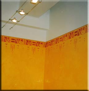 Geschäftsraum in sonnengelben Stucco (in der Bordüre versteckt sich der Name "Evelina")